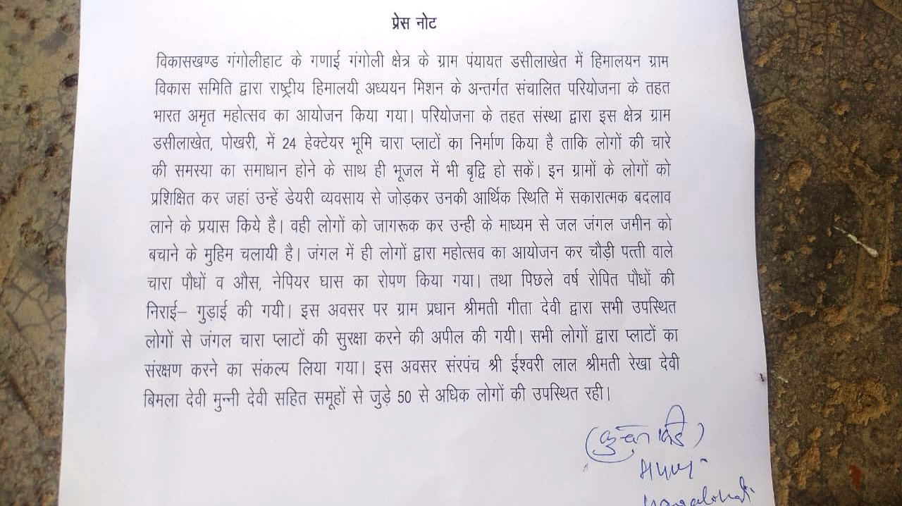 राष्ट्रीय हिमालयी अध्ययन मिशन के तहत चल रही प्रयोजना मे आजादी का अमॄत उत्सव को मनाते हुये सुदूर उत्तराखण्ड मे हिमालय की गोद मे बसे गगोलीहाट मे स्थानीय गीतो के साथ वृक्षारोपण किया गया | और आजादी के इतिहास पर व्याख्यान भी दिया|
