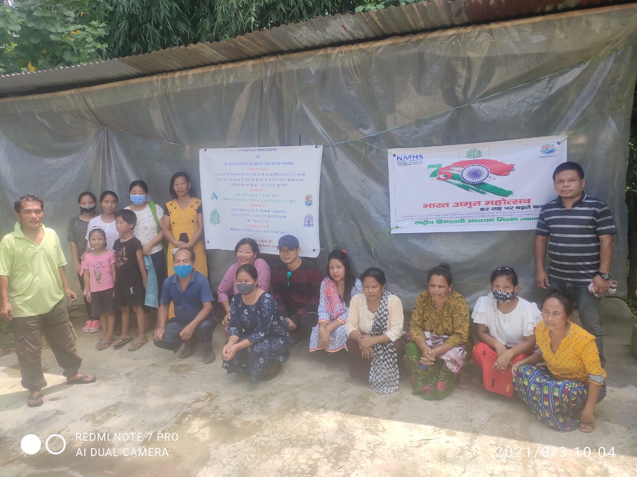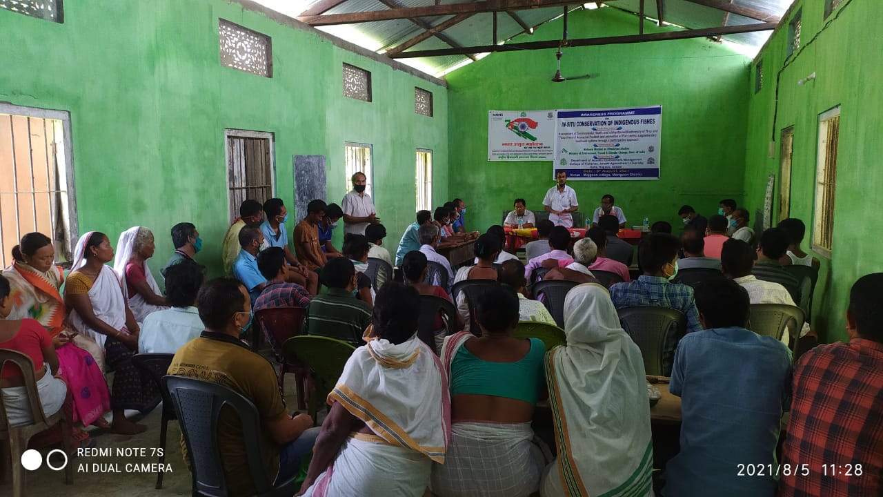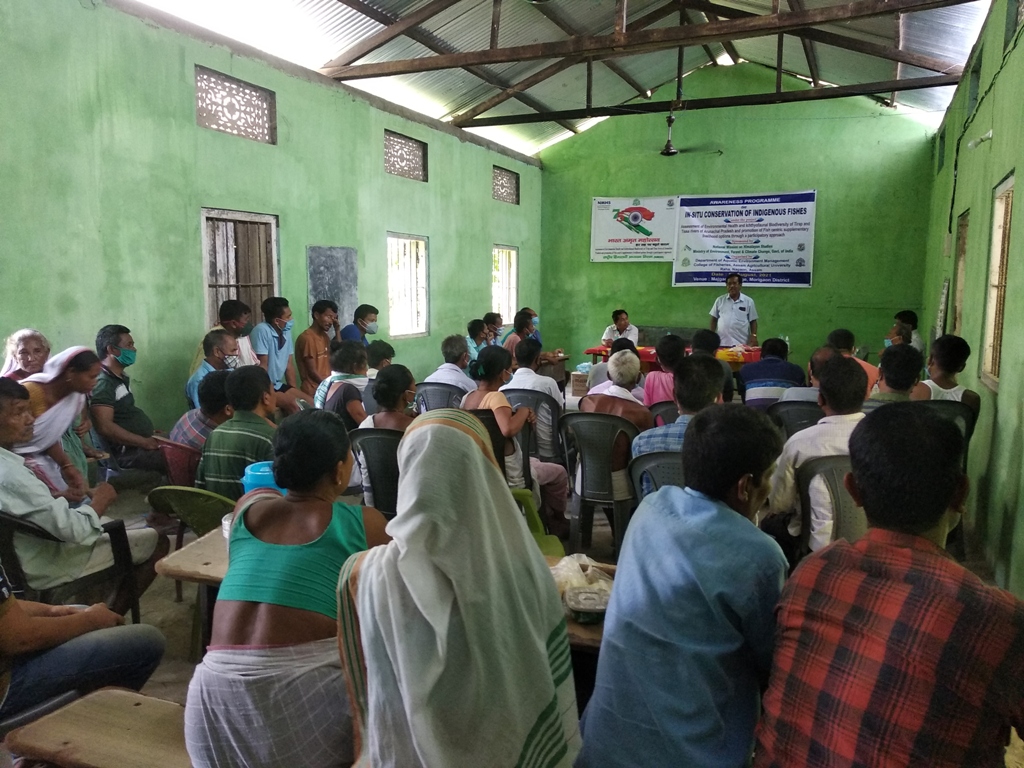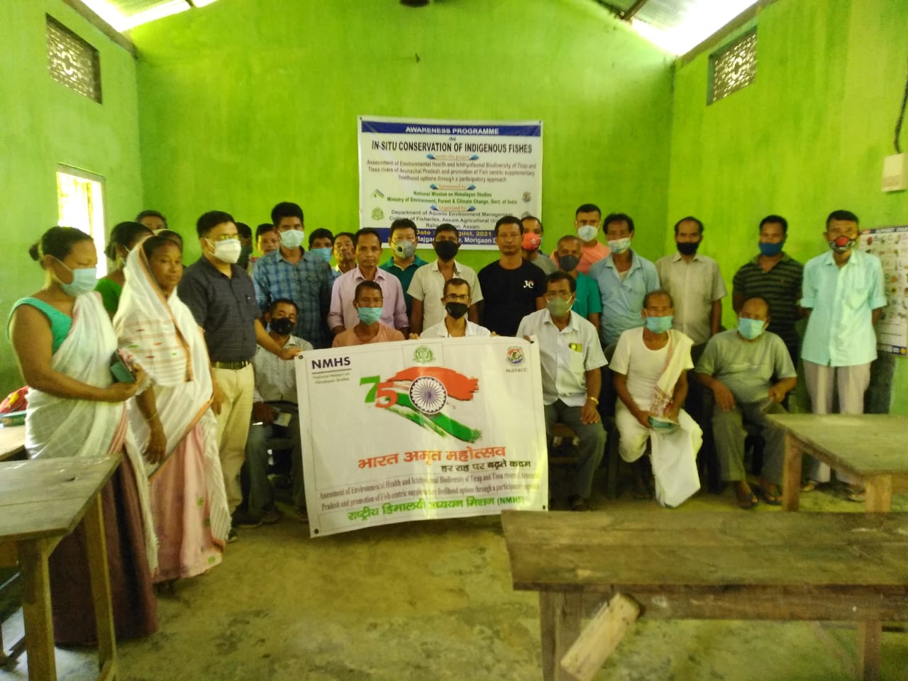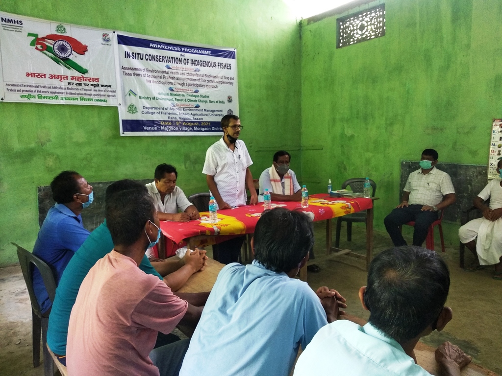 Continuing the celebrations of 75 years of Independence of India through Bharat Amrut Mohatsav Department of Aquatic Environment Management, College of Fisheries, Assam Agricultural University, Raha, Nagaon, Assam under the NMHS sponsored project "Assessment of Environmental Health and Ichthyofaunal Biodiversity of Tirap and Tissa rivers of Arunachal Pradesh and promotion of Fish centric supplementary livelihood options through a participatory approach" organised two daylong Awareness Programmes on "In-situ conservation of Indigenous Fishes" on 3rd & 5th August, 2021 respectively. The first programme was held at Deomali, Tirap district, Arunachal Pradesh where 50 villagers participated and interacted with experts. The second programme was held at Majgaon village, Morigaon district, Assam where a total number of 56 villagers took part. Measures for conservation of indigenous fish faunal resources of rivers of North Eastern Himalayan region were discussed during the programmes.