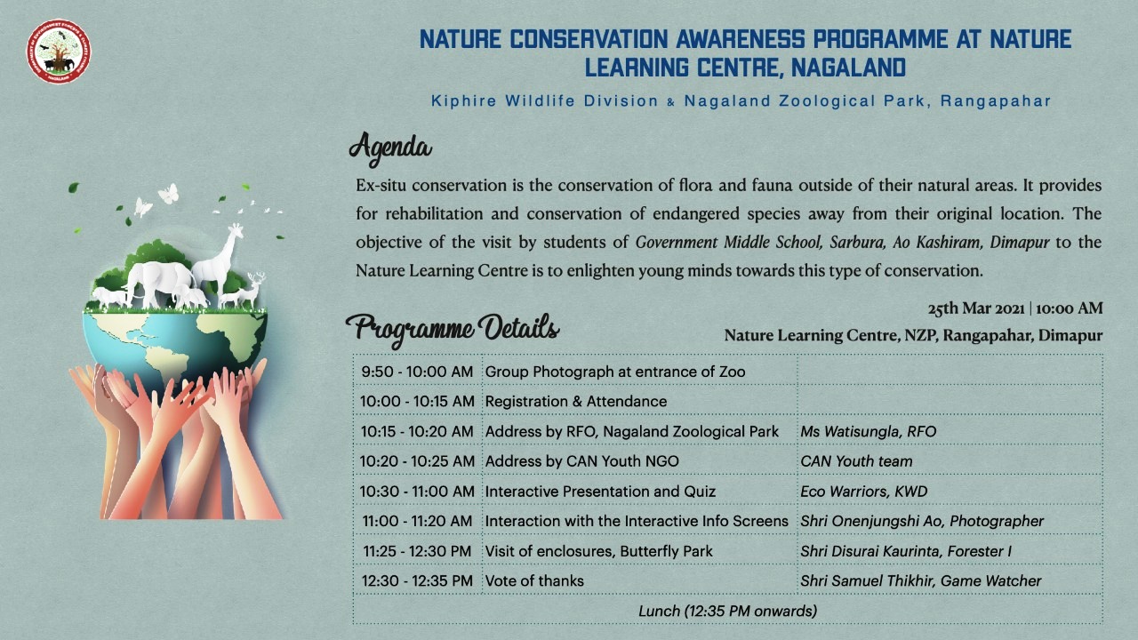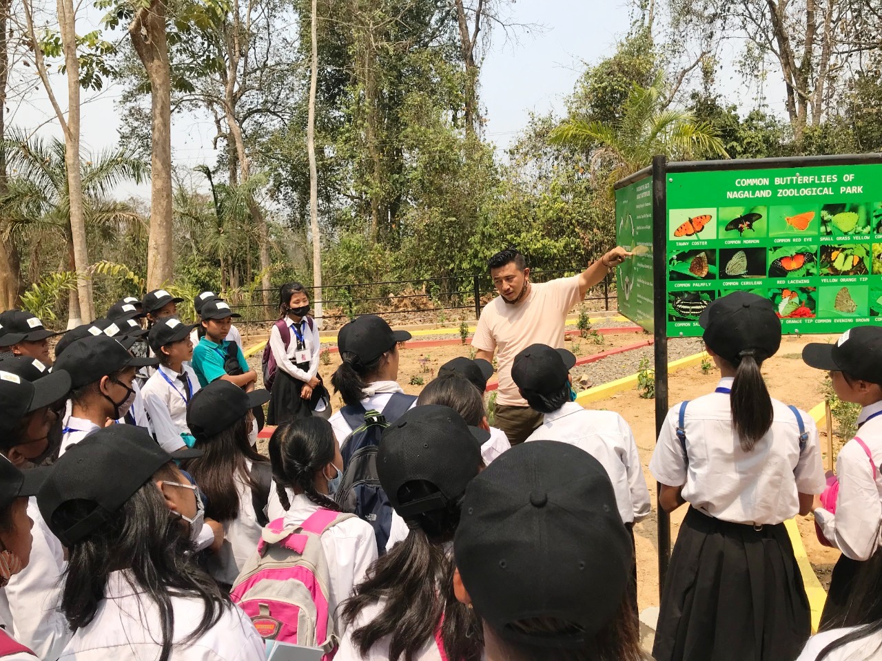 The Department of Environment, Forests & Climate Change, Government of Nagaland on 25th March, 2021 conducted an Nature Conservation Awareness Programme at Nature Learning Centre, Nagaland for 83 participants from Government Middle School, Sarbura, Ao Kashiram, Dimapur. An interactive awareness session and wildlife quiz was followed by interaction with the interactive info screens. This was followed by a visit of the zoo enclosures, butterfly park and nature trail.